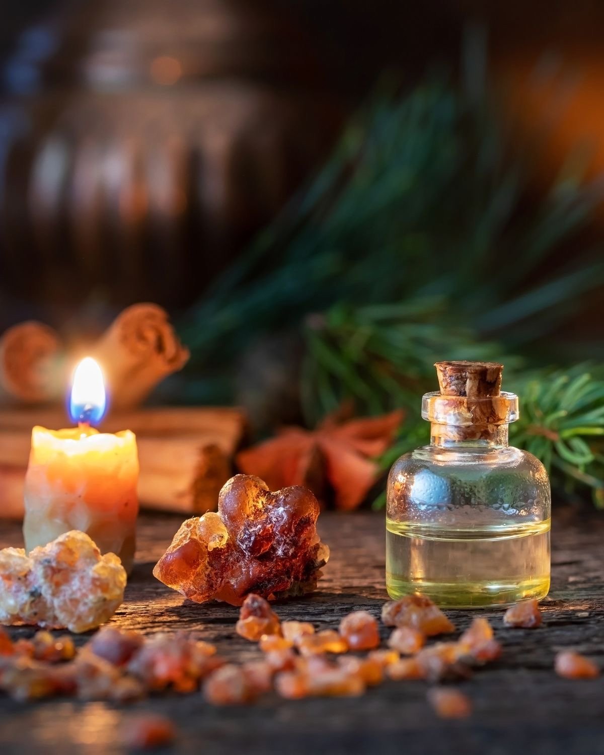 Myrrh gives off a rich, resinous scent with smoky and slightly bitter tones. It adds a spiritual and ancient quality to blends, often paired with frankincense.